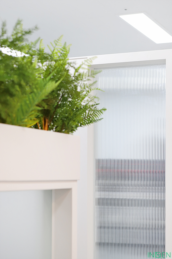 불투명 유리 가벽과 낮은 수납장을