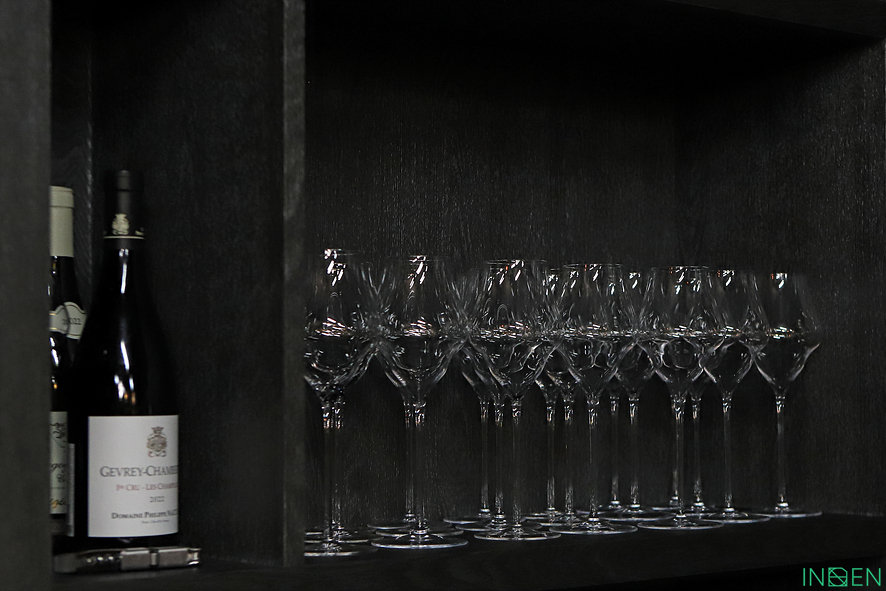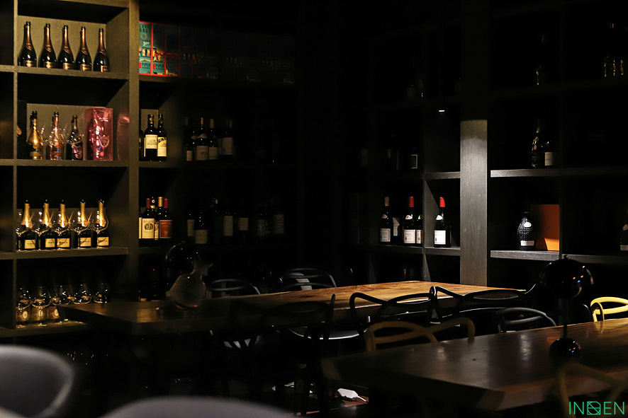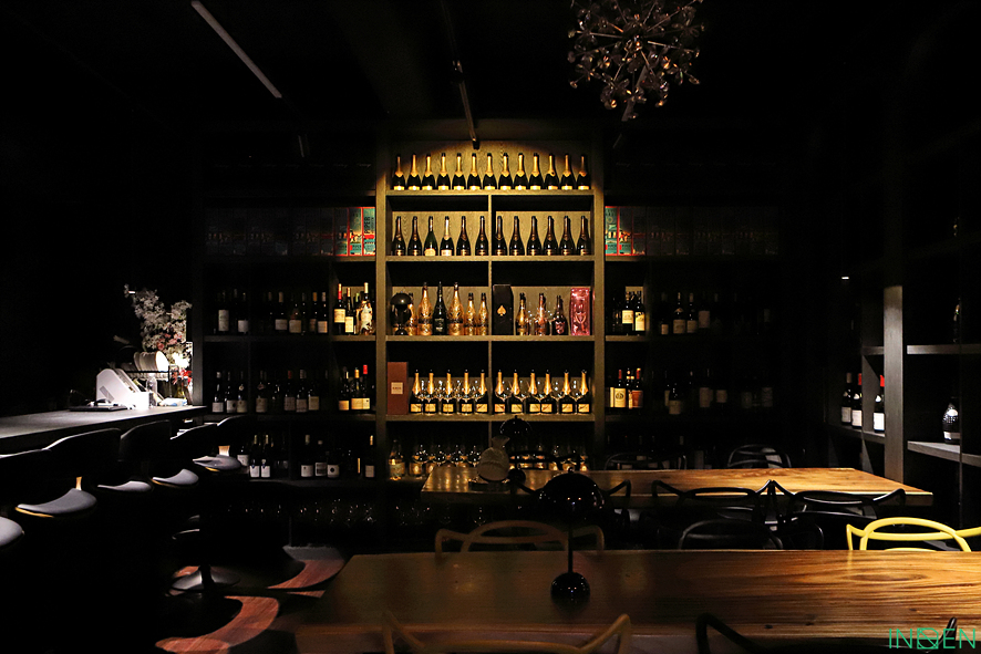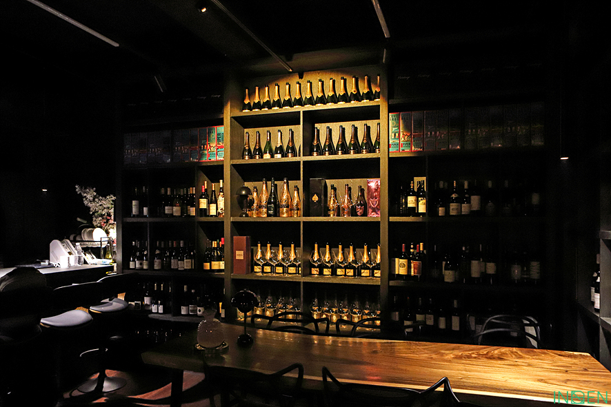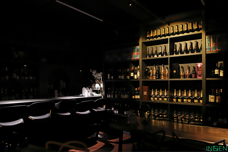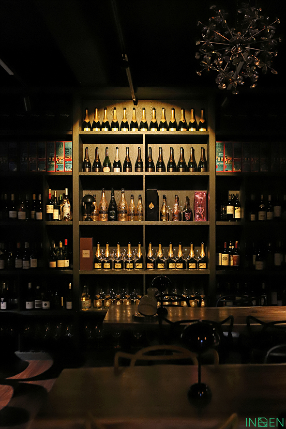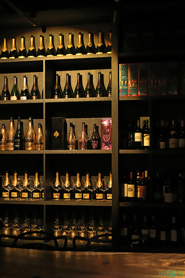 와인과 술병이 가득한 진열장과 은은한 조명