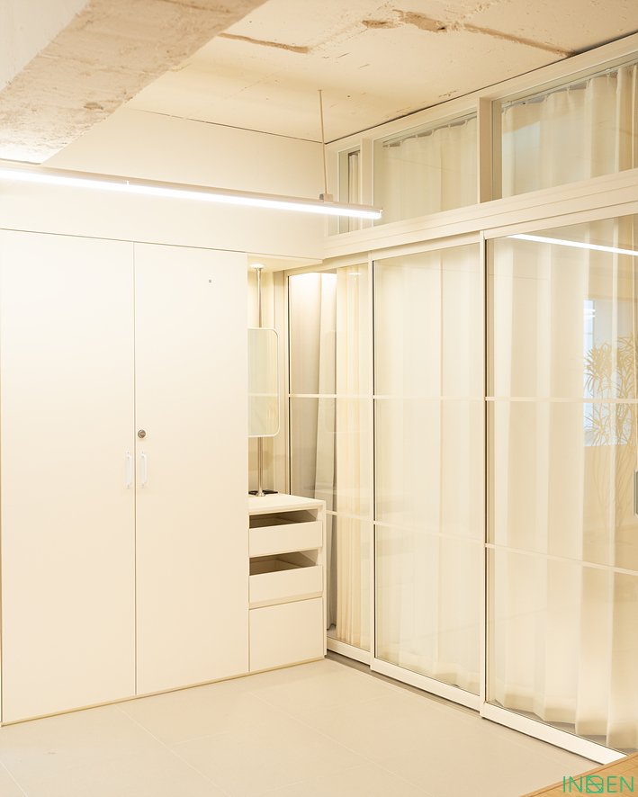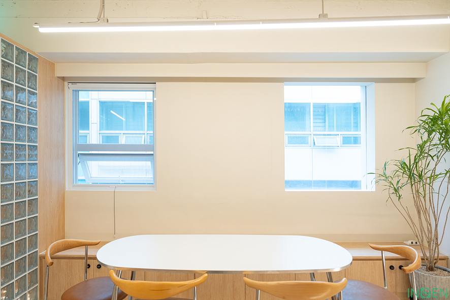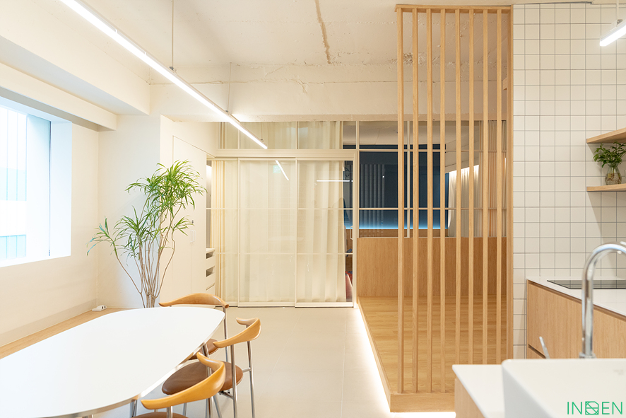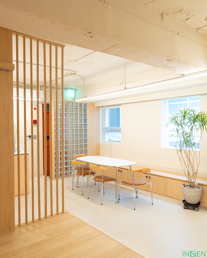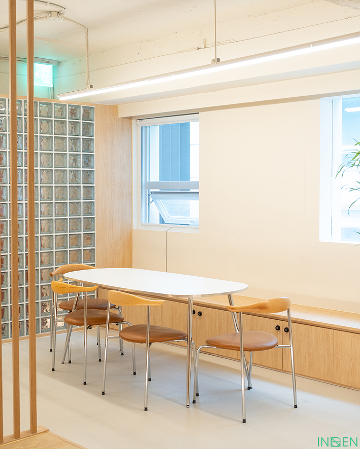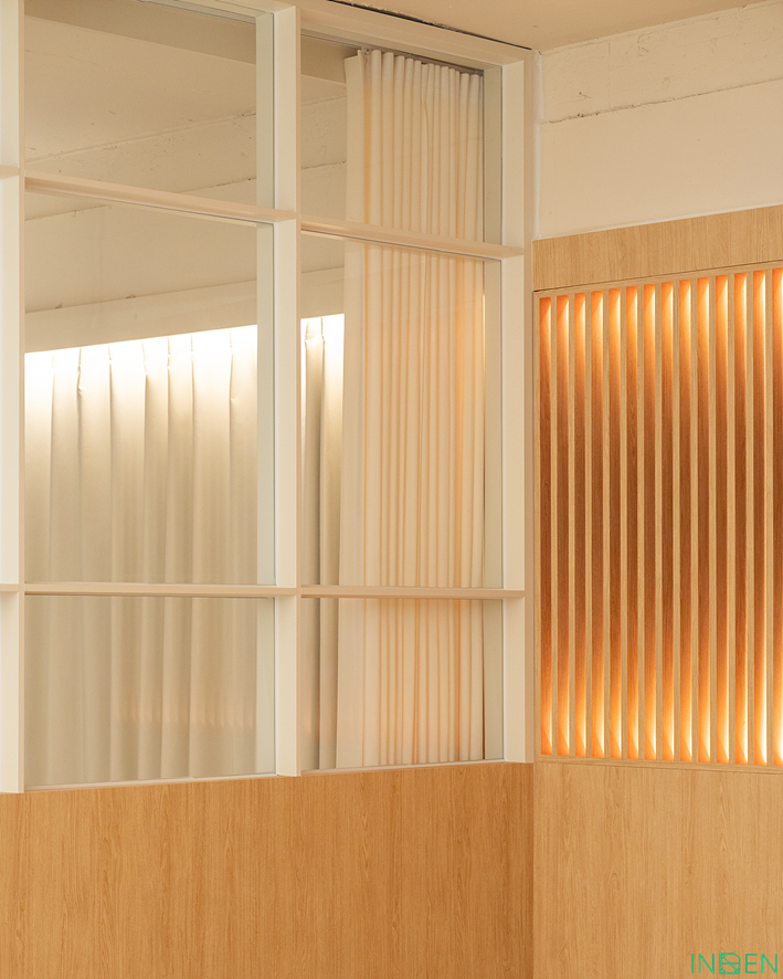 격자형 유리 파티션으로 공간을 분리한 후,