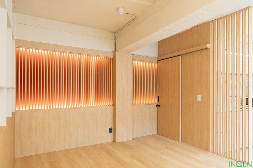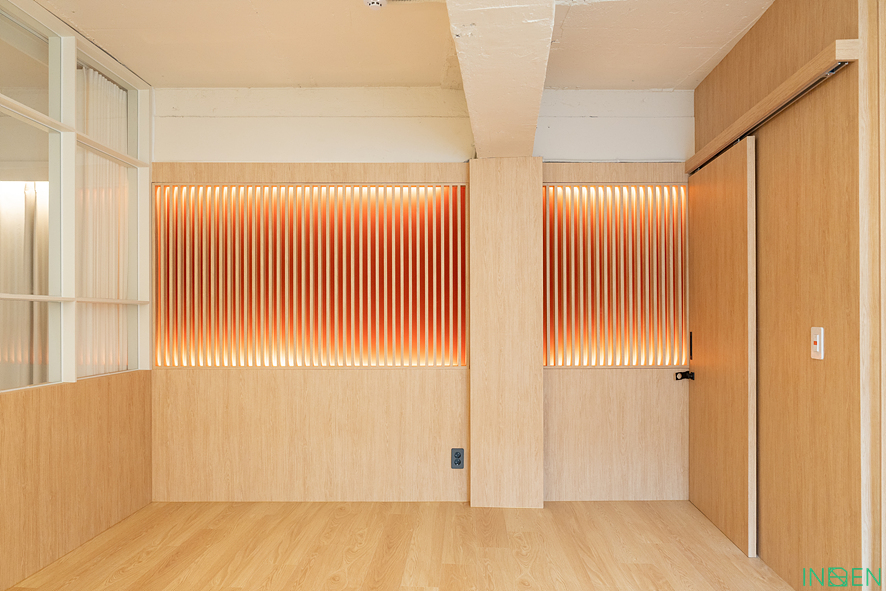 한쪽 벽면에는 우드 톤 마감재와