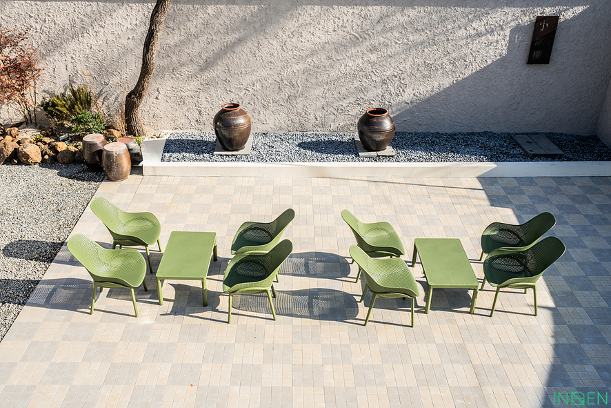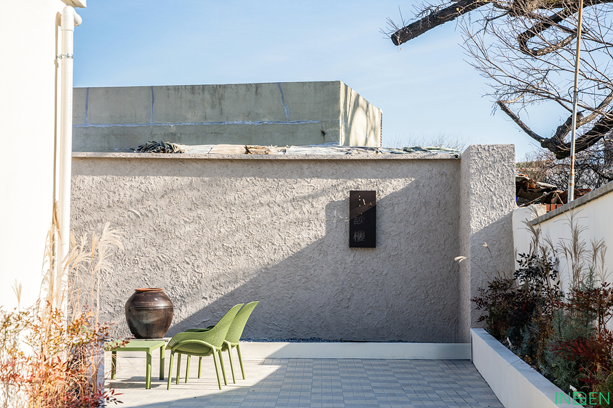 야외 좌석은 담장, 자갈, 나무, 돌 등