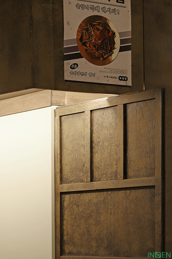 우드 패널과 메뉴명이 적힌