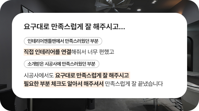 | [인테리어젠틀맨] 9평 광진구 아워어스 헤어샵 인테리어 리모델링 고객 후기 (2) | 2025.10.20 |