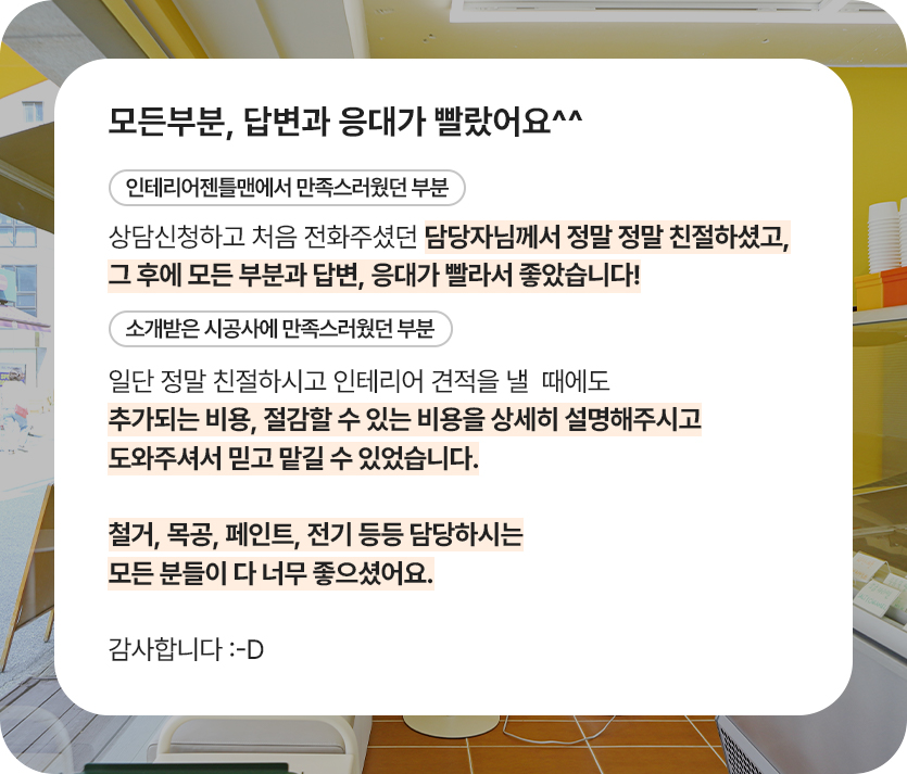 믿고 공사를 맡길 수 있었다고 전해주셨습니다.